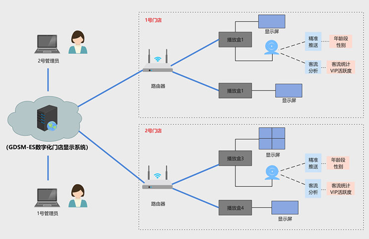 该客户为宁波地区零售门店,在一段时间内,客户发现门店销售额持续下滑,但是不知道原因出在哪里,到底是消费者减少,还是广告推送出现问题,亦或是其他原因,客户没有头绪,K8凯发科技数据化门店显示系统完美的解决了客户痛点,方案拓扑图如下: