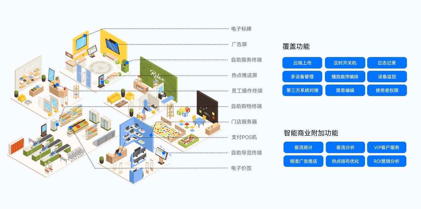 K8凯发智慧零售解决方案搭配K8凯发GDSM-ES智能零售管理系统,为全球零售门店客户提供了功能齐全的数字化运营管理工具,提供广告显示信息编辑、信息发布、AI识别、客户分析和会员管理等功能,实现对设备、内容、营销、运营的综合数智化管理能力,为精准运营管理赋能。
