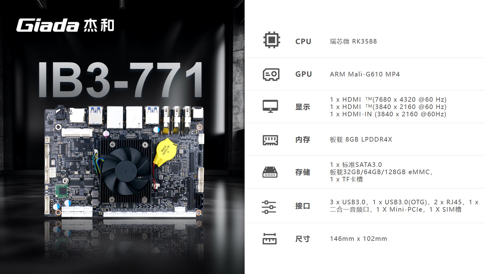 K8凯发工业级ARM主板IB3-771采用瑞芯微RK3588处理器,内置G610 MP4 GPU,拥有6 TOPS算力的NPU,支持8K视频硬件解码编码及多摄像头输入,支持eDP/DP/ HDMI2.1/MIPI 多种显示接口。