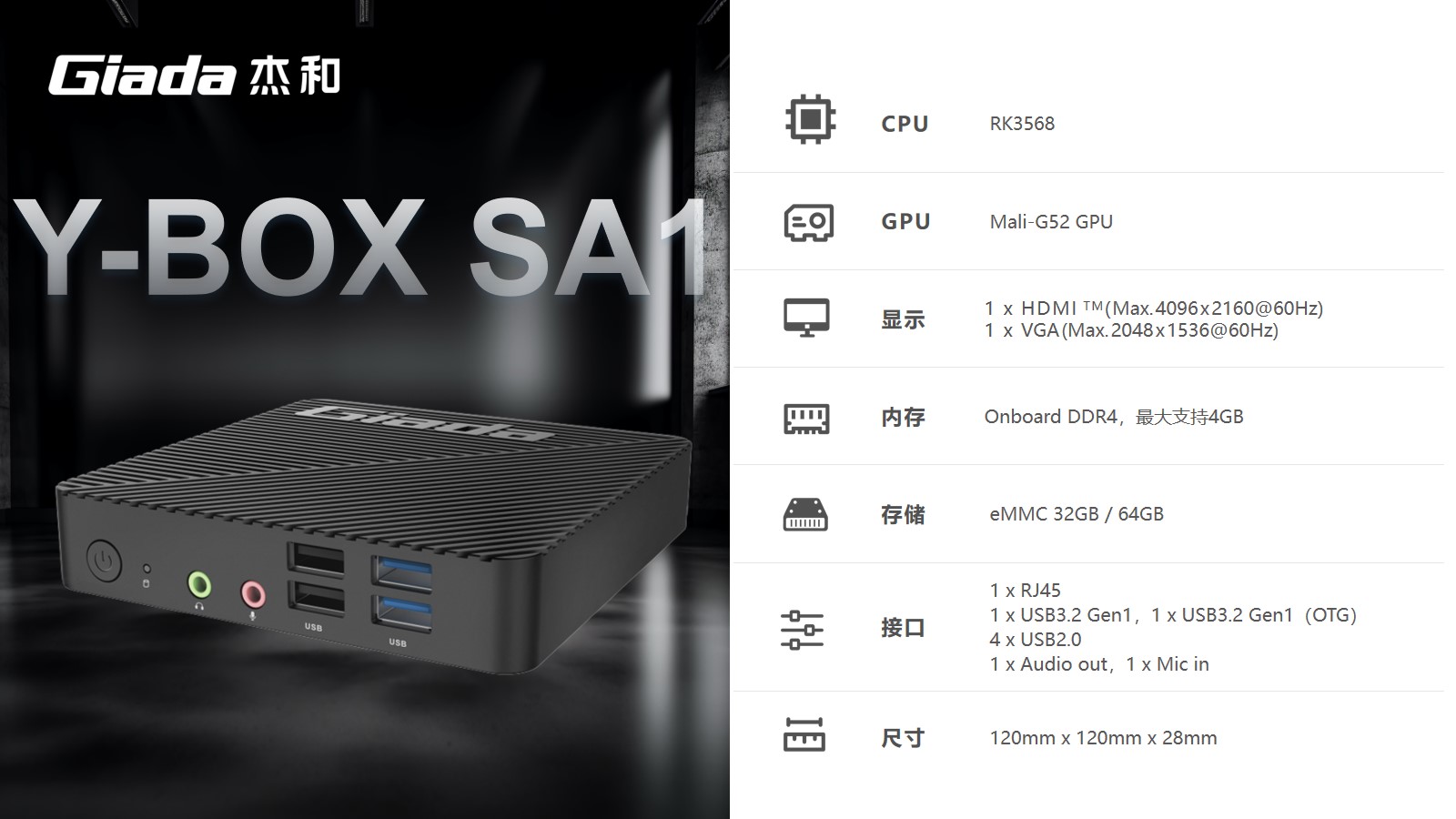 Y-BOX SA1配备1 x USB3.2 Gen1,1 x USB3.2 Gen1(OTG),4 x USB2.0,总共6个USB接口,可以连接各种USB外设,如键盘、鼠标、U盘、打印机、摄像头;支持千兆自适应网口,支持无线上网, 板载 Wi-Fi/BT模块,可选 M.2(2230)规格,满足现代办公环境需要高速数据传输的企业用户,或是追求灵活移动性的家庭用户的需求。