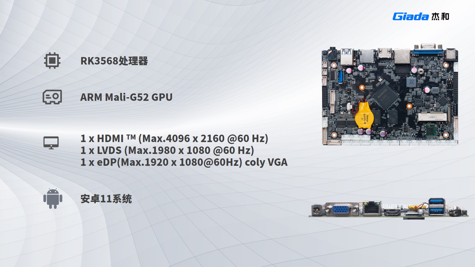 与前面几款产品对比,IB3-771拥有更强的算力,能够处理高达3200万像素的图像数据,适用于边缘计算设备和智能终端,如智能监控、工业自动化和智能零售;搭载瑞芯微RK3588处理器,支持安卓12系统,内置G610 MC4 GPU,支持8K视频硬件解码编码及多摄像头输入,提供eDP/DP/ HDMI2.1/MIPI 多种显示接口。