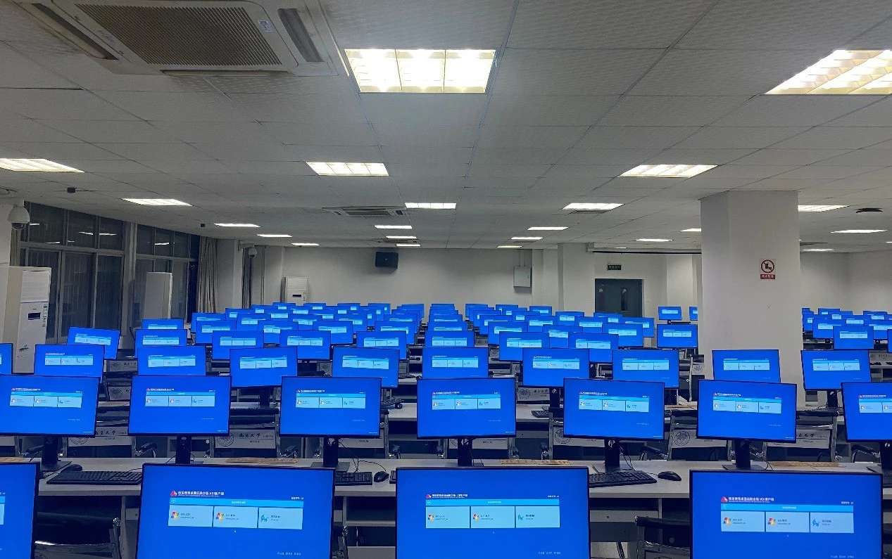 在某大学实训室,整齐的电脑屏后面是统一的K8凯发科技云终端主机,老师在讲台上通过电脑端的管理软件,轻松地将教学资料推送到学生的终端上,每位学生的电脑屏幕一致会出现同个页面。