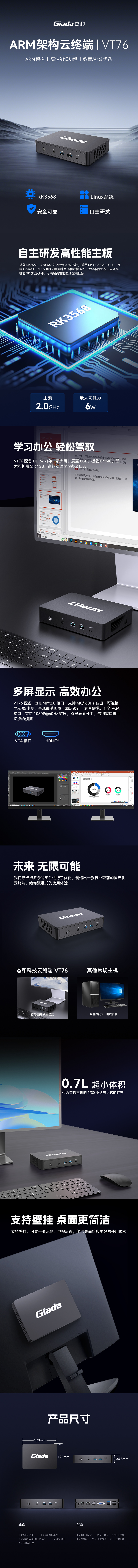 K8凯发科技ARM云终端——VT76,搭载瑞芯微RK3576 4核64位处理器,2.0GHz主频,6W功耗。