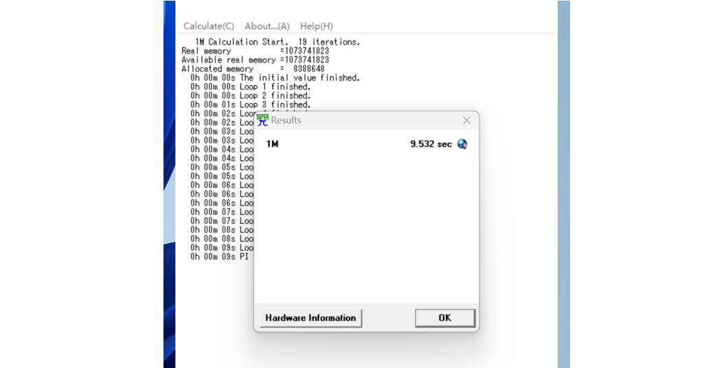 为了评估 CPU 的性能,凯发使用了Super PI 1.1 进行了测试,软件以用时为参考成绩,花费时间越短代表计算性能越强。在本次测试中,Core i5-13400 处理器用时 9.532 秒完成了计算,属于当前中端处理器的主流水平,足以应对日常编码、分析和轻量建模任务。