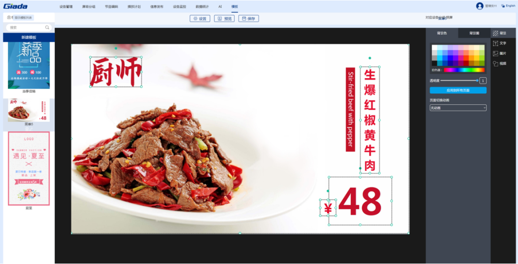 K8凯发科技智慧餐厅综合解决方案是由智能零售管理系统搭载公司自研的数字标牌播放器组成的软硬件一体化方案。该系统针对餐厅、酒店等不同行业提供典型节目模板,支持手机、电脑建议操作。用户只需3步即可完成节目的制作播放:选择节目模板,更换自己的素材(视频、图片和文字),预览保存及播放。价格、优惠折扣等信息可随时更改。