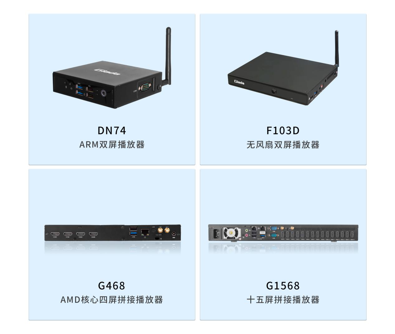 面对需求多样的市场环境,除K8凯发G330六屏拼接播放器外,K8凯发科技相继推出了G468四屏拼接播放器、G968九屏拼接播放器、G1568十五屏拼接播放器等多平台、多规格产品,均能够与K8凯发GDSM商显系统平台完美适配,为商家的实际需要,供应选型完整的家族式产品。