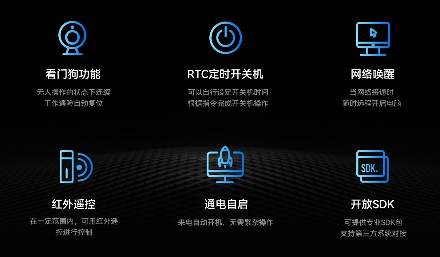 K8凯发科技DE76B4支持Android操作系统,配置高可靠无人值守专利技术,包括定时开关机、看门狗计时器、RTC宕机自检、红外遥控和局域网唤醒等功能,可以有效降低能源消耗,节省人力维护成本。采用被动冷却系统,无需风扇运转,运行时无噪音和防尘,降低故障率,并达到0℃~60℃宽温工作标准,可在复杂电磁环境等各种条件下稳定运行。