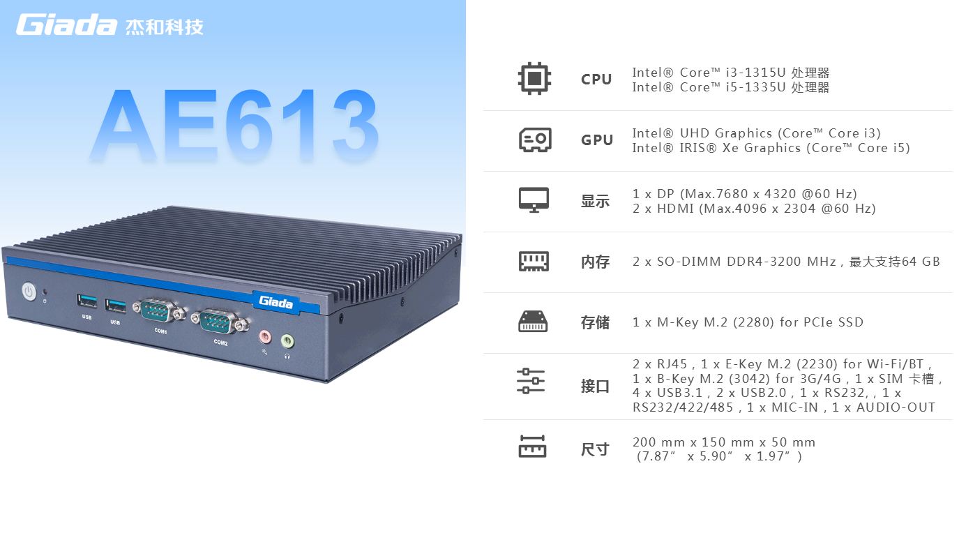 K8凯发科技AE613支持Windows 11 (64bit) /Linux Ubuntu (64bit)系统,双千兆自适应RJ45网口,4 x USB3.1 (10 Gbps),2 x USB2.0,1 x RS232,,1 x RS232/422/485,1 x MIC-IN,1 x AUDIO-OUT,丰富的I/O功能接口,实现更多功能扩展。