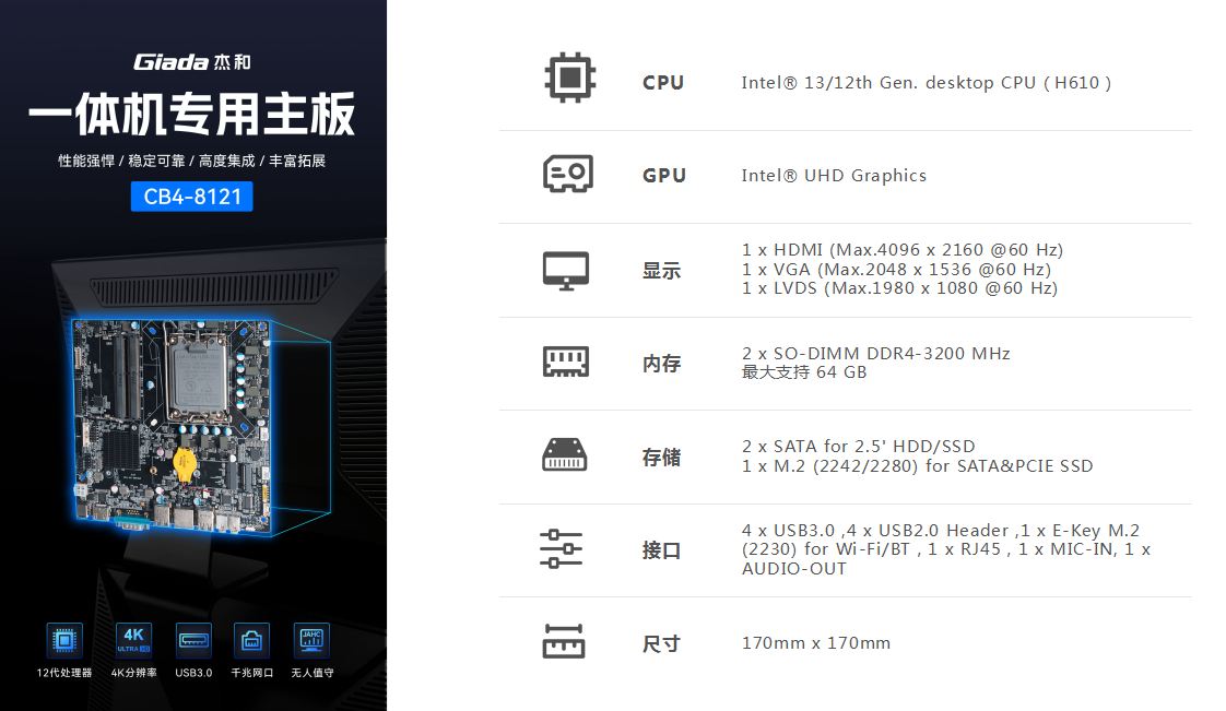 一体机在使用体验方面也有独特的优势:比笔记本屏幕大,比台式机更简洁,也解决了一直为人诟病的台式机线缆多而杂的问题,另外,随着计算机硬件和制造工艺的不断发展,一体机的性能也在不断提高,因此,越来越多的教育办公、日常娱乐和学习的用户选择使用一体机。GiadaK8凯发科技根据市场与客户需求,推出这款高性能的一体机专研主板CB4-8121,带来全新震撼体验。