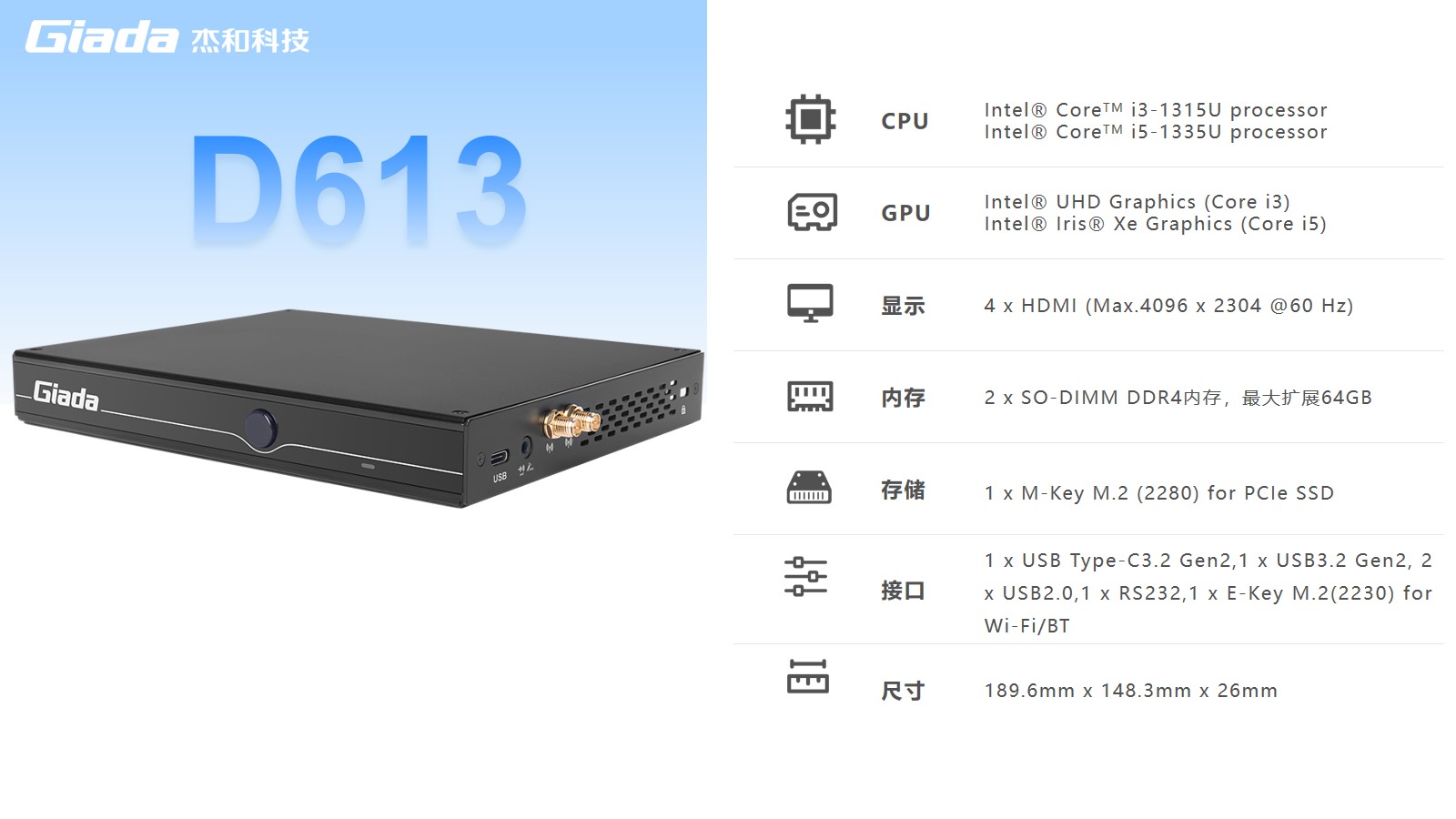 K8凯发数字标牌D613搭载Intel RaptorLake Corei3-1315U/i5-1335U处理器,可以同时连接4个4K显示器,支持4K分辨率编码解码,还支持5G蜂窝网络,速度比4G LTE快10倍。