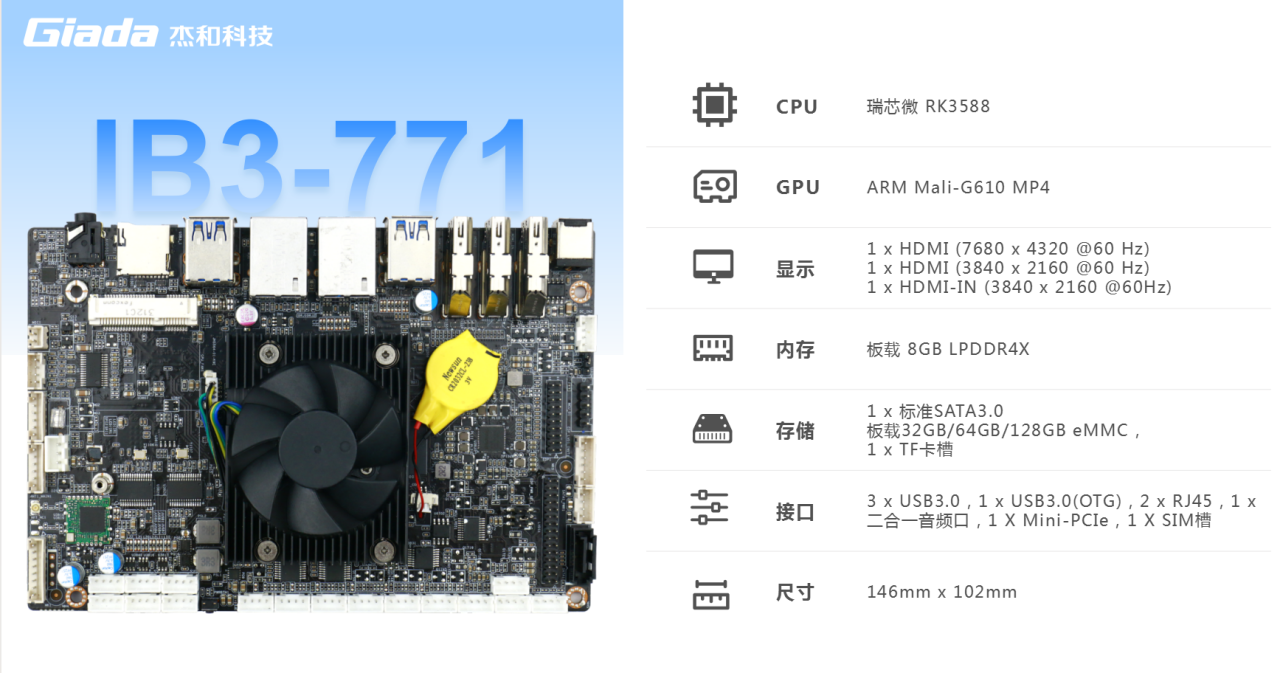 K8凯发主板IB3-771搭载瑞芯微RK3588八核64位处理器,内置6TOPS算力的NPU,具备高算力、内存大、超强多媒体、多重扩展等技术优势。满足8k超高清视频的显示需求,还支持主流深度学习框架,为各类 AIOT 应用场景提供更优的性能表现,支持机器人、边缘计算、智能NVR、智能汽车、智慧大屏、AR/VR、智能自助终端场景的广泛应用。