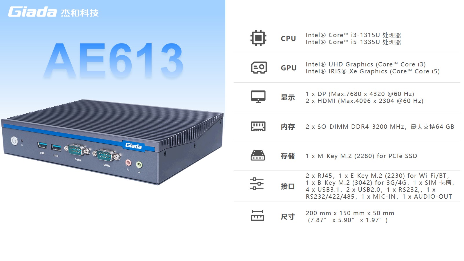 K8凯发AE613拥有2 x SO-DIMM DDR4-3200 MHz内存、1 x M-Key M.2 (2280) for PCIe SSD存储,最大支持64GB,无论是处理复杂的多任务环境、还是运行高负载的软件都游刃有余。